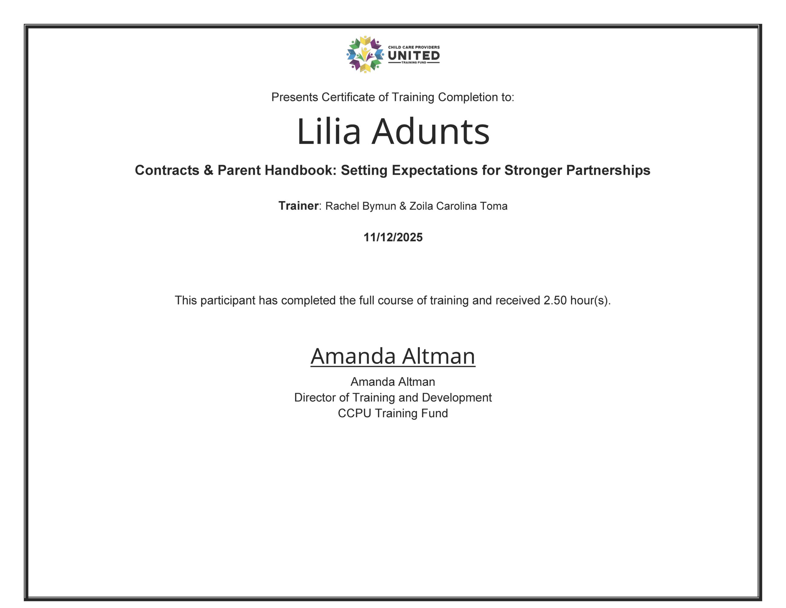 We take pride in our dedication to continuous learning and professional development. Below are the certificates we’ve earned through hard work, commitment, and passion for providing the best care and education for your children. Each certificate represents a step forward in our journey to ensure a safe, fun, and enriching environment for your little ones.
